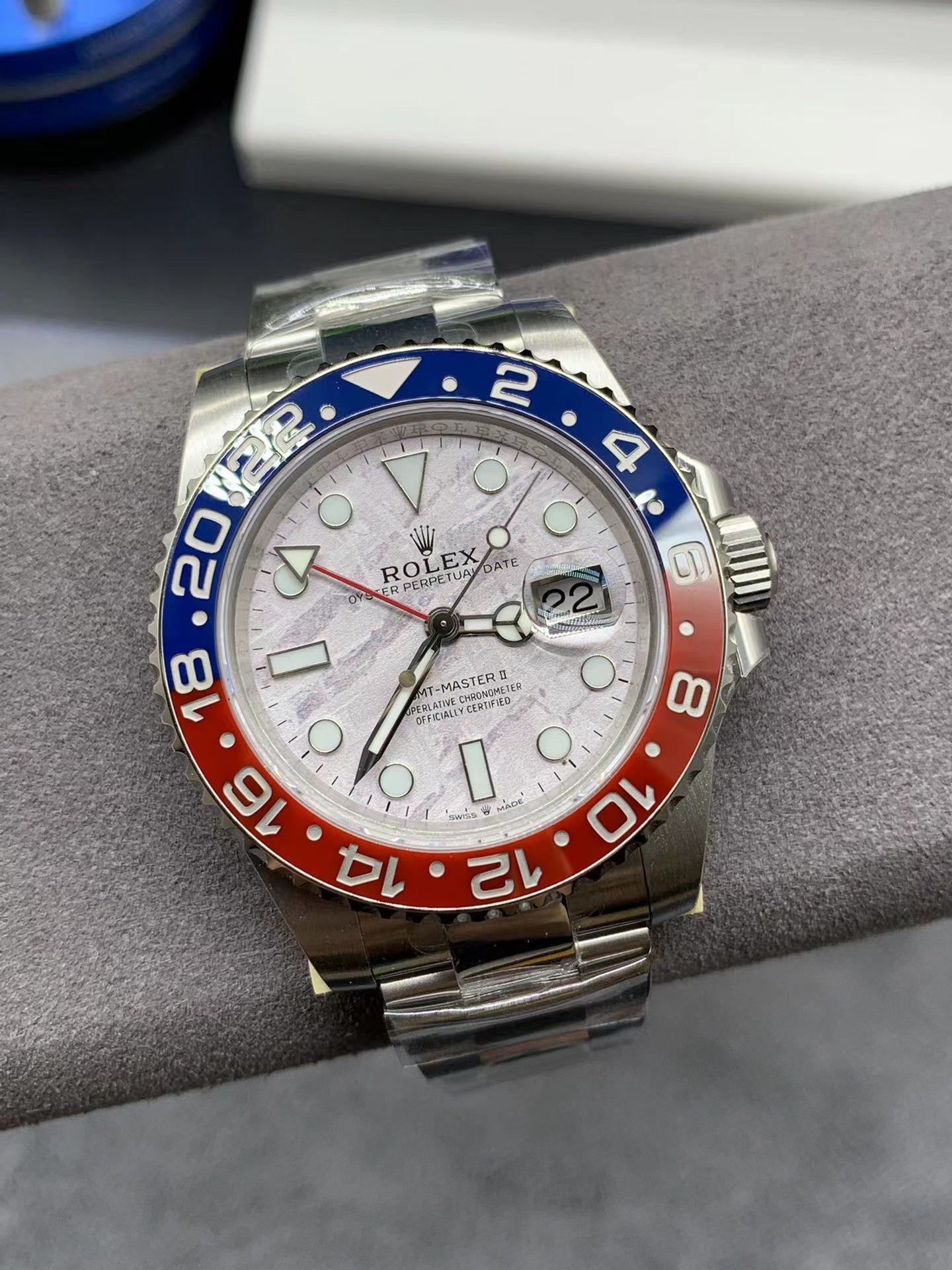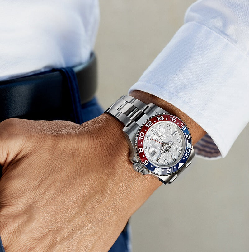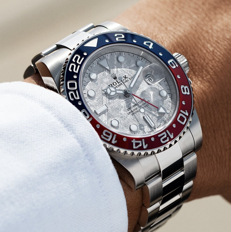 GMTマスターⅡのメテオライトダイアルはこのモデルのみである。爆発した小惑星、もしくは惑星の中心部にあったメテオライトは、太陽系を飛び越えて我々の惑星の軌道に偶然取り込まれ、重力に引き寄せられて地球へと落下する。この壮大な旅の途中、溶けた小惑星の核がゆっくりと冷やされることでメテオライトの中心が徐々に変化し、極めて珍しい金属の模様を作り出す。